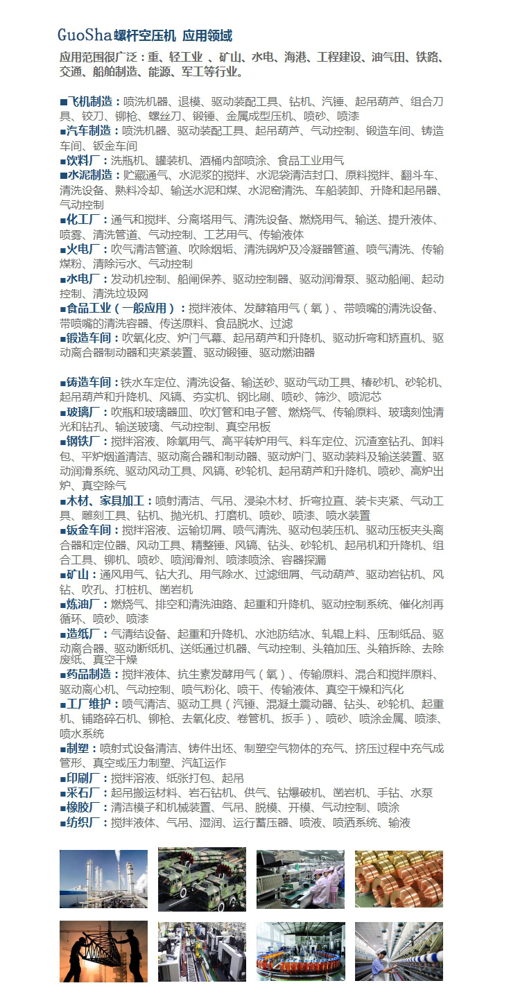 GS高壓螺桿式空氣壓縮機為我國工業生產企業設計制造的一種最新大排量供氣裝置。其結構簡單,易損件少,能在大的壓力差或壓力比的工況下,排氣溫度低,對制冷劑中含有大量的潤滑油(常稱為濕行程)不敏感,有良好的輸氣量調節性,很快占據了大容量往復式壓縮機的使用范圍,而且不斷地向中等容量范圍延伸,廣泛應用于全球制造業、軍事和航空領域,應用于任何需要使用安全可靠氣源的產業,如廣泛的應用于鋼鐵、石化、電力、造紙、電子、化工、制藥和食品等各種行業,以及在冷凍、冷藏、空調和等制冷裝置上。